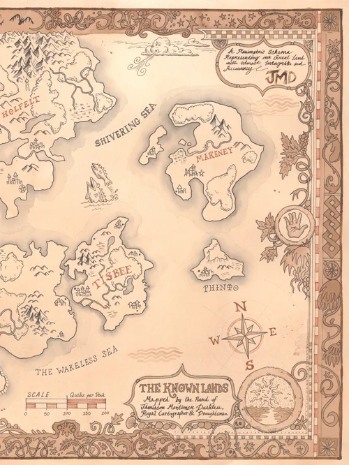 Hand drafted cartography depicting fantastical lands. Pen & Ink wash on Arches C.P. watercolor paper. 60” x 18”, drawn 2021-2022.