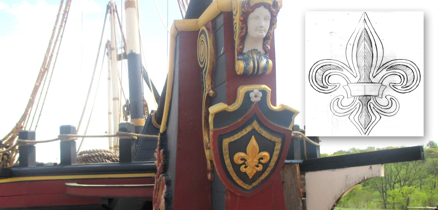 Fleur de Lis; hand drawn template, layers cut from foam core to create depth. Smoothed with painters mud and painted gold.